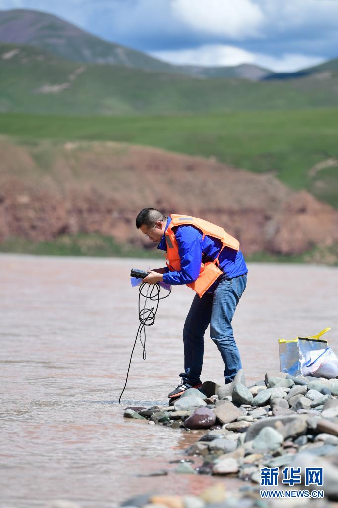 2021年长江源综合科考的科考队员赵良元在通天河流域观测水文(7月24日摄)。