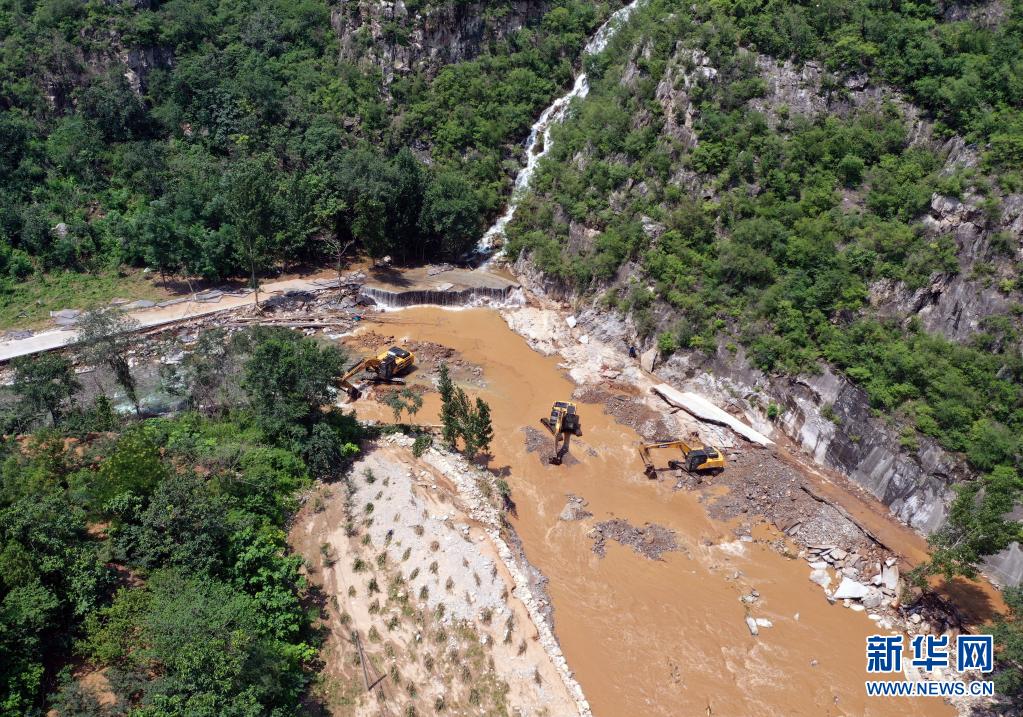 7月25日,在淇县黄洞乡鱼大线公路旁,三台挖掘机同时作业,抢修道路(无人机照片)。