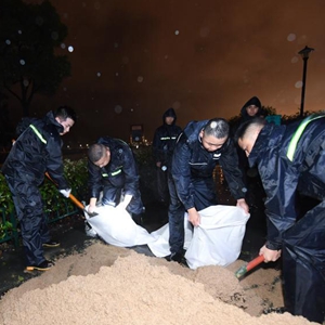 7月25日晚,在毗邻杭州湾的浙江嘉兴平湖市乍浦汤山公园,工作人员加紧垒沙包以防海水倒灌。