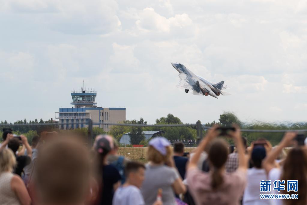 7月25日,在俄罗斯首都莫斯科附近的茹科夫斯基市,苏-57战斗机起飞进行表演。