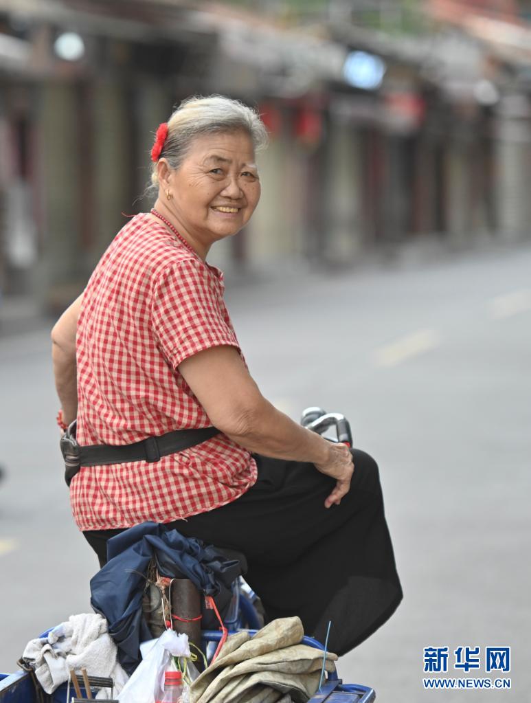 7月7日,头戴小红花的阿婆骑着三轮车经过泉州西街。新华社记者 宋为伟 摄