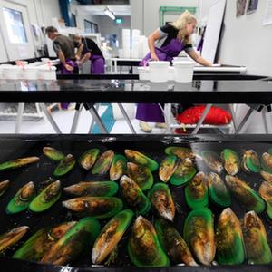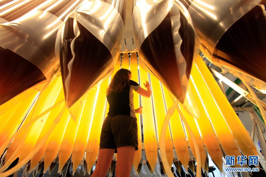 这张未标注拍摄日期的照片显示的是工作人员在位于新西兰南岛纳尔逊附近的新西兰贝类生产与技术实验室照看水管中饲养的海草。新华社发(桑德福渔业供图)