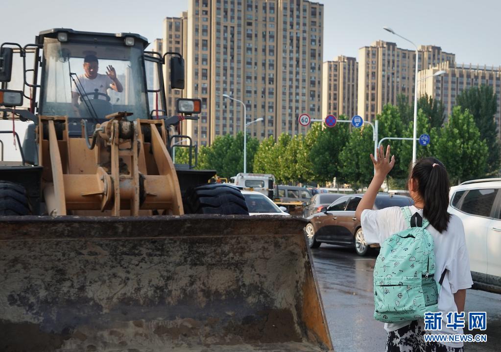 7月25日,居民乘坐李伟的铲车越过积水道路后,向李伟挥手致谢。新华社记者李安摄