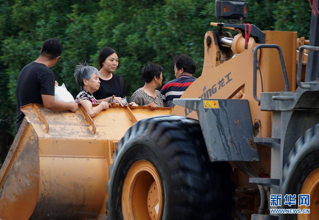 7月25日,居民乘坐李伟驾驶的铲车越过积水道路。新华社记者李安摄
