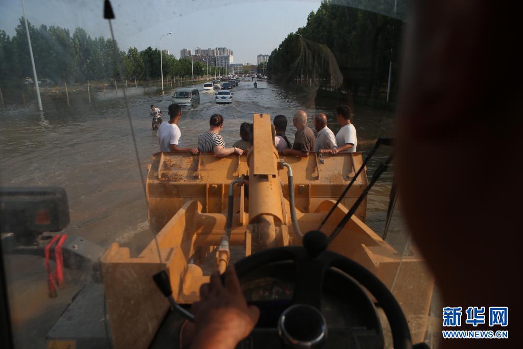 7月25日,李伟驾驶铲车运送居民越过积水道路。新华社记者 许雅楠 摄