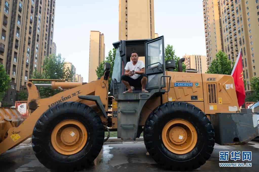 7月25日,在郑州市白沙镇,李伟与自己的铲车合影。新华社记者 才扬 摄