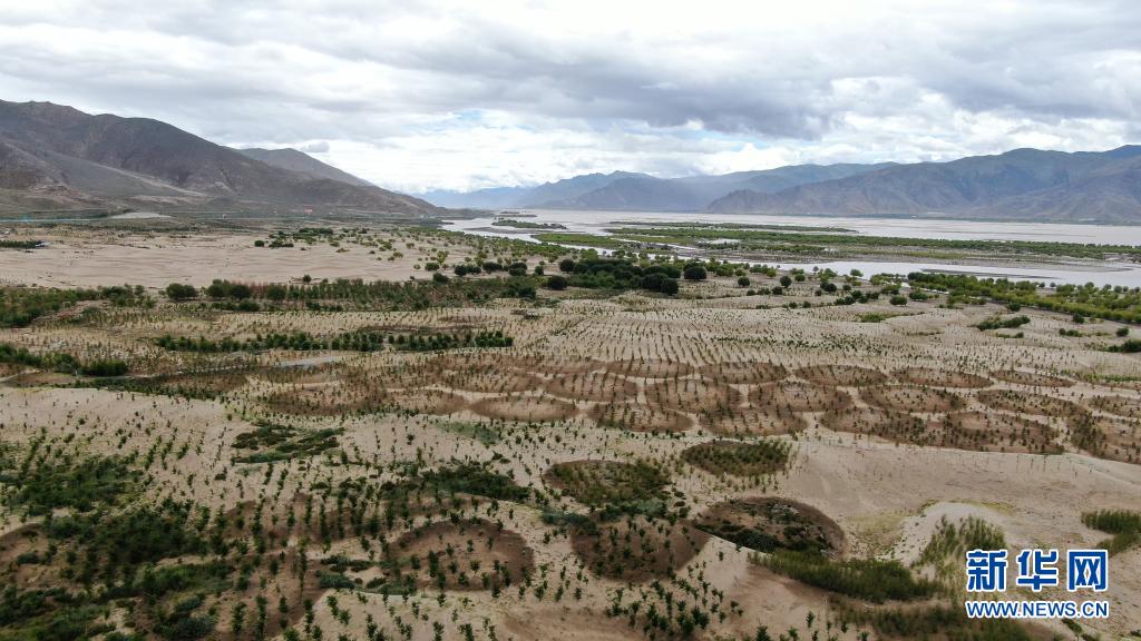 雅鲁藏布江山南段沙丘上的人工林(7月20日摄,无人机照片)。新华社记者 晋美多吉 摄