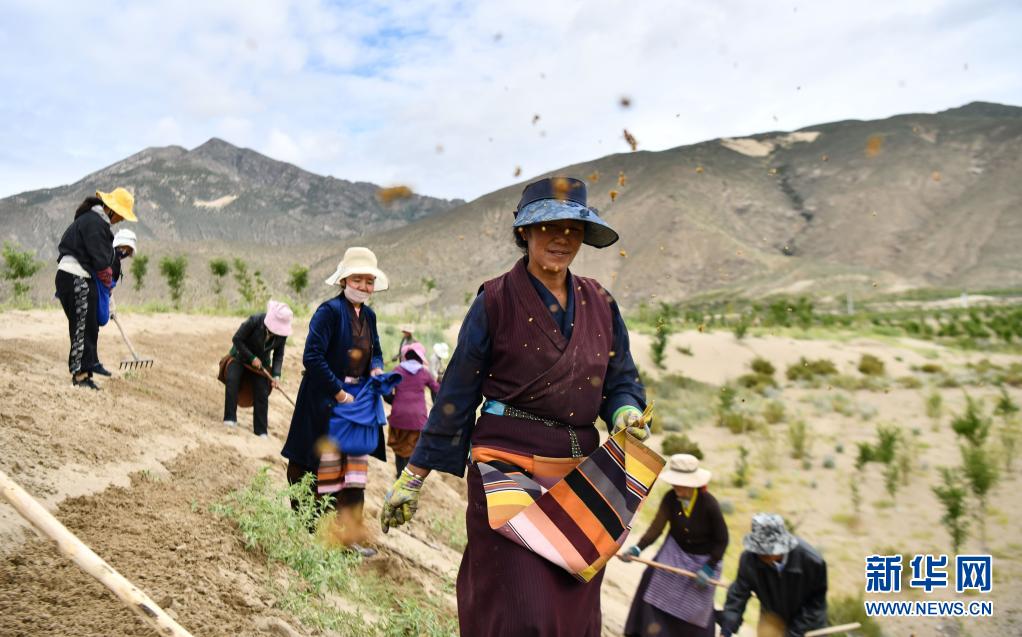 雅鲁藏布江山南段沙丘上,当地群众在进行人工造林(7月20日摄)。新华社记者 晋美多吉 摄
