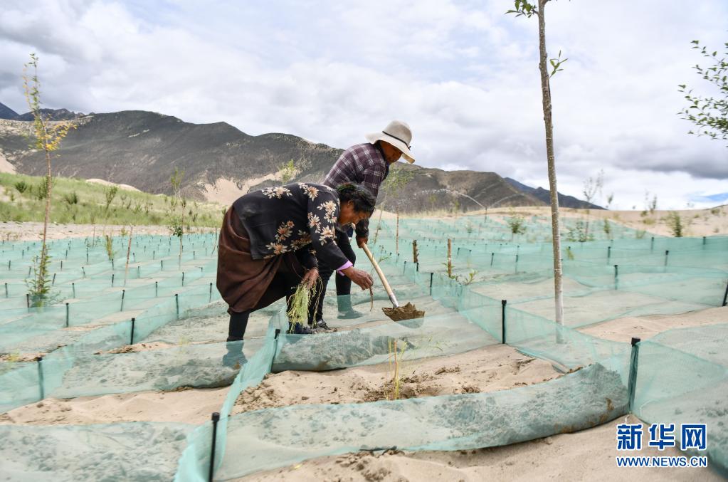 在山南市全国防沙治沙综合示范区,当地群众在沙地上栽种树苗(7月20日摄)。新华社记者 晋美多吉 摄
