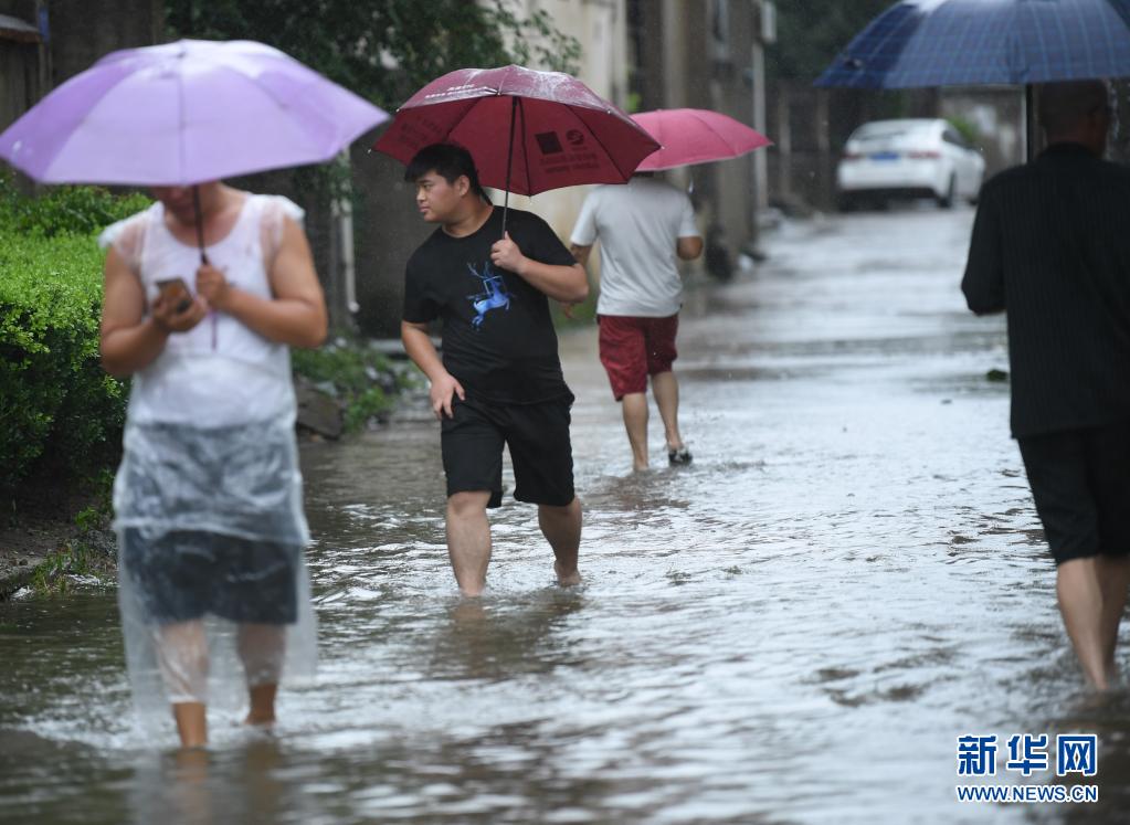 7月26日,在宁波慈溪市横河镇,居民涉水出行。