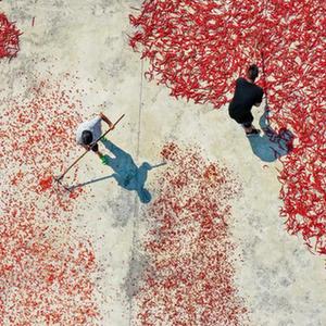 近日,贵州省铜仁市玉屏侗族自治县田坪镇的辣椒迎来丰收,当地农户抓紧时间采摘、晾晒辣椒,房前屋后呈现一片红红火火的丰收景象。