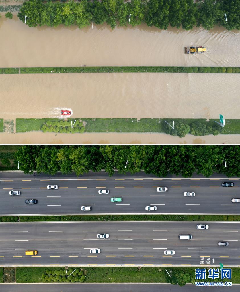 这是一张拼版照片:上图为7月22日,在郑州市中牟县阜外华中心血管病医院附近,救援人员利用舟艇转移人员(新华社记者才扬摄,无人机照片);下图为7月26日,在郑州市中牟县阜外华中心血管病医院附近同样的位置,社会车辆已经正常通行(新华社记者李安摄,无人机照片)。