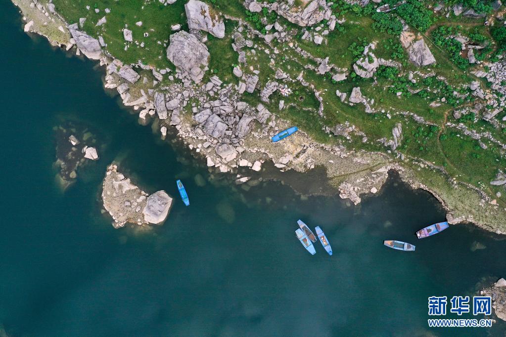 停靠在贵州省黔西市新仁苗族乡化屋村旁的小船(无人机照片)。新华社记者 杨文斌 摄