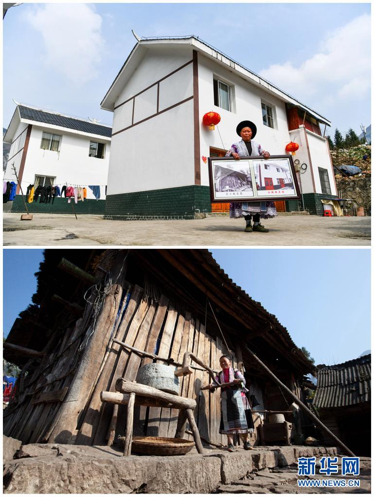 这是一张拼版照片:上图为2021年2月20日,在贵州省黔西市新仁苗族乡化屋村麻窝寨易地扶贫搬迁集中安置点,苗族村民王祥萍站在新房前展示自家搬迁前后的对比照片(新华社记者杨文斌摄);下图为2008年12月29日,苗族村民王祥萍在化屋村麻窝寨搬迁前的老屋前磨玉米(史开心 摄)。新华社发