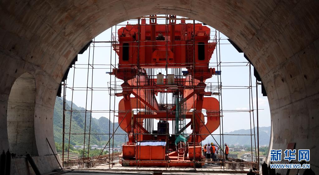 7月26日,贵南高铁澄江双线特大桥施工人员在吊装最后一榀箱梁。新华社发(高东风 摄)