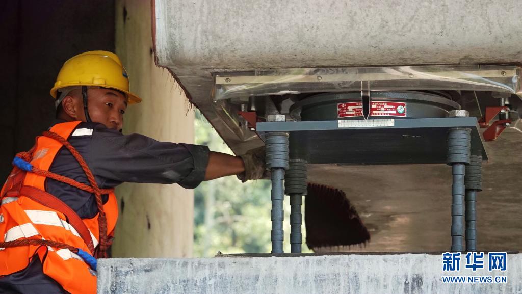 7月26日,施工人员为贵南高铁澄江双线特大桥最后一榀箱梁安装支座螺丝。新华社发(高东风 摄)