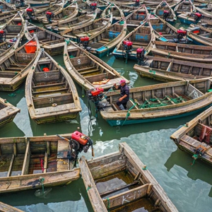7月26日,养殖作业的舢舨停靠在山东荣成桑沟湾北海岸一处港湾码头躲避台风(无人机照片)。