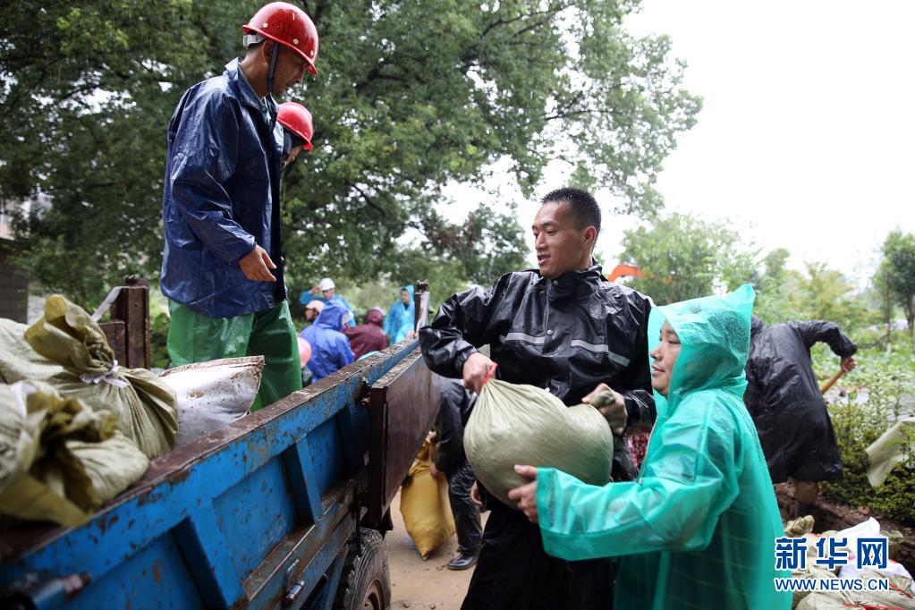 7月26日,在浙江省东阳市虎鹿镇葛宅村下溪头自然村,抢险救灾应急人员冒着风雨装运沙袋。