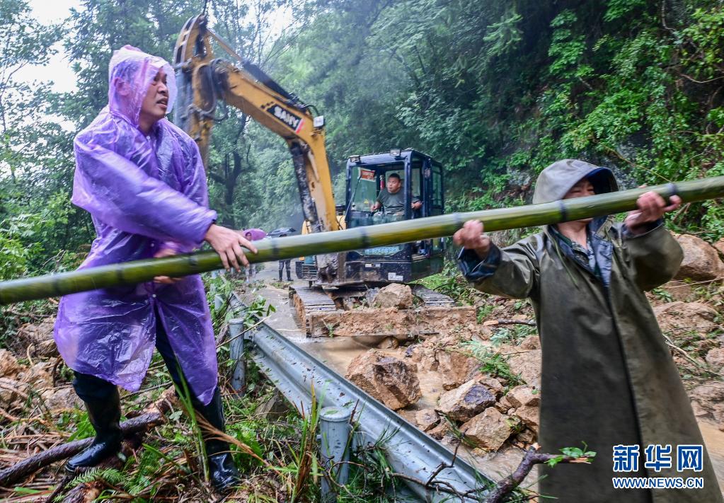 7月26日,在浙江省金华市磐安县大盘镇林丰村,党员干部冒雨清理塌方山石树木。