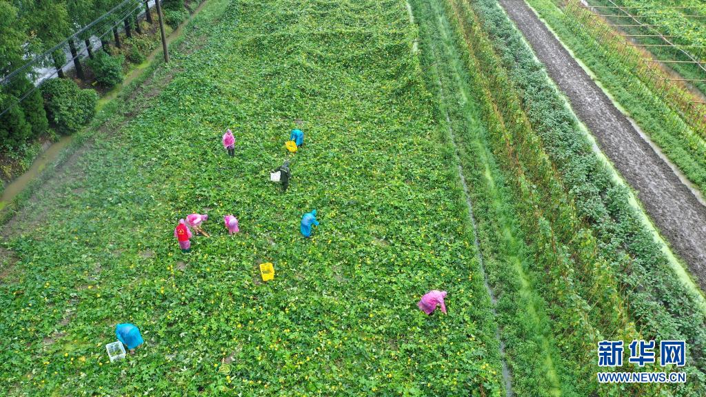 7月26日,在浙江省湖州市德清县乾元镇恒星村蔬菜基地,党员干部冒雨帮助种植户采收丝瓜(无人机照片)。