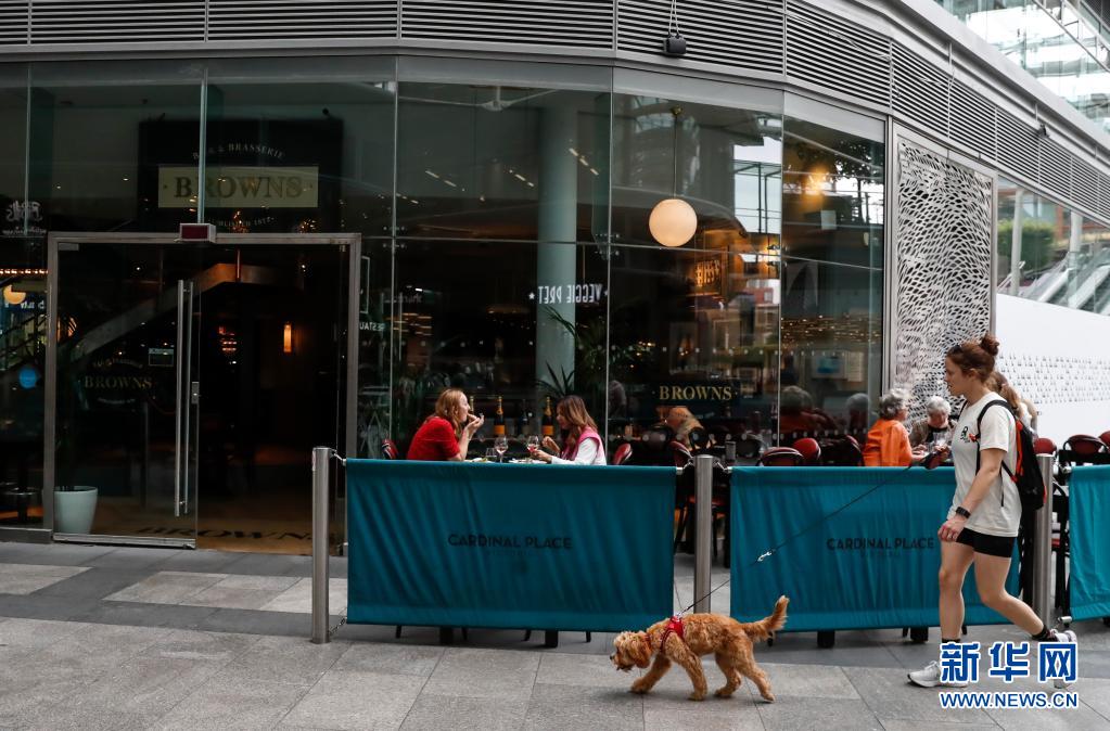 7月26日,人们坐在英国伦敦维多利亚一家餐厅的户外餐饮区。