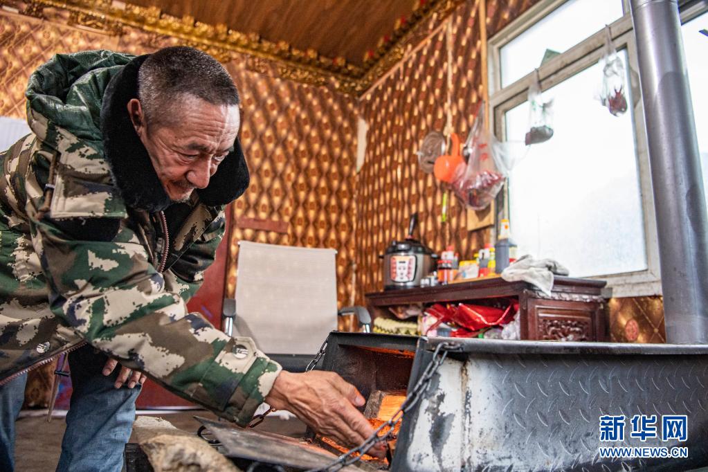 在易贡乡通加村担任村党支部书记的索朗次仁给炉子生火(4月1日摄)。新华社记者 孙非 摄