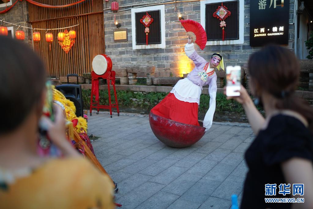 封永泉在“不倒翁”底座上表演采茶戏,吸引不少观众拍照(7月21日摄)。