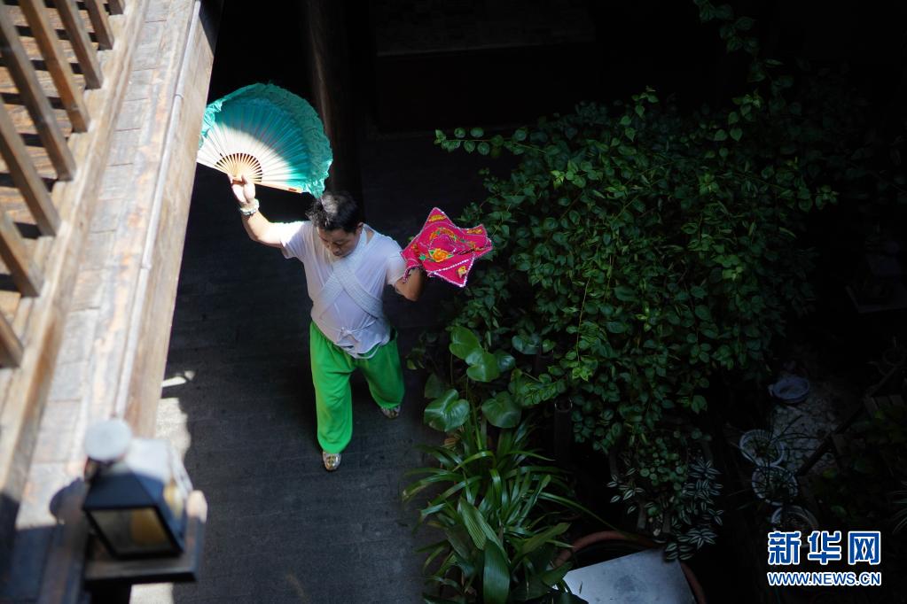 封永泉在景区一家餐馆内练习(7月22日摄)。