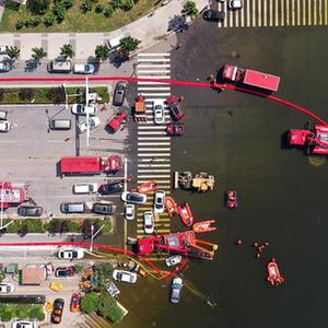 7月27日,救援人员在卫辉市区架设排涝设备(无人机照片)。近日,受持续强降雨影响,河南省新乡卫辉市城区积水严重。目前,救援人员正在积极开展排涝作业。新华社记者 李安 摄