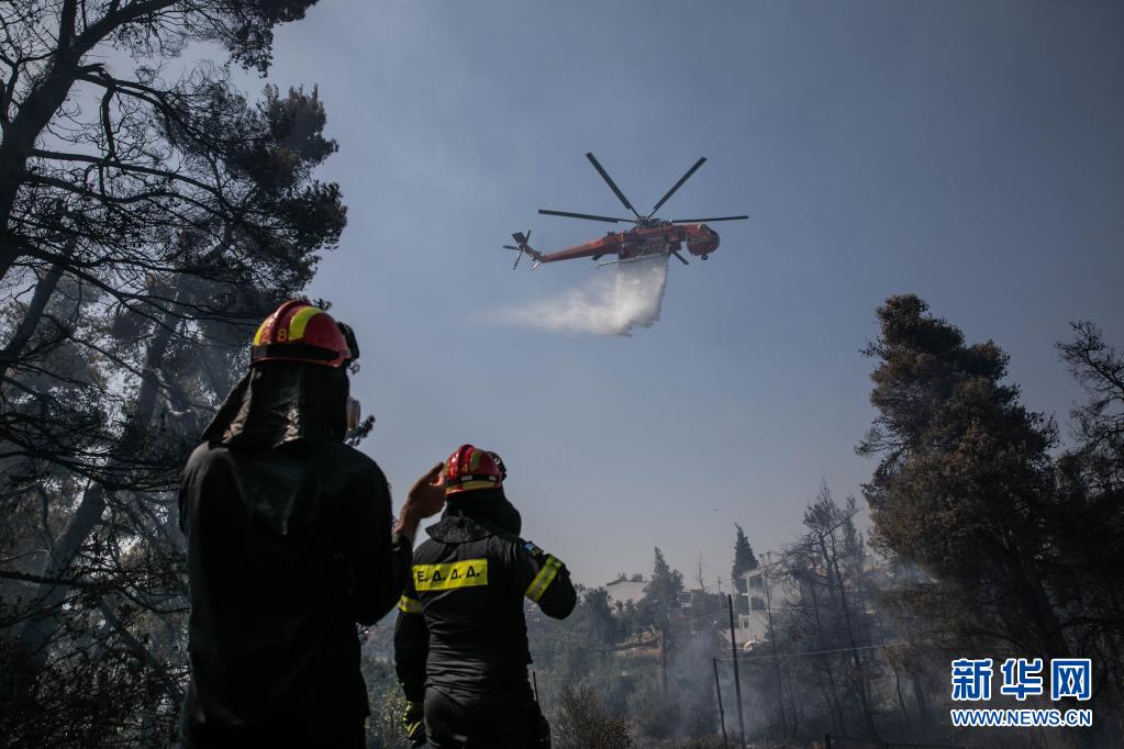 7月27日,一架直升机在希腊阿提卡州火灾现场作业。当日,希腊阿提卡州发生山火,相关部门派出141名消防员参与扑灭工作。新华社发(莱夫泰里斯摄)