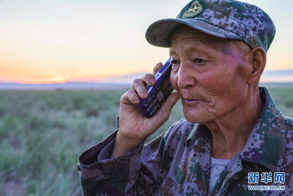 魏德友在放牧赶羊途中用手机和女儿联系(6月8日摄)。