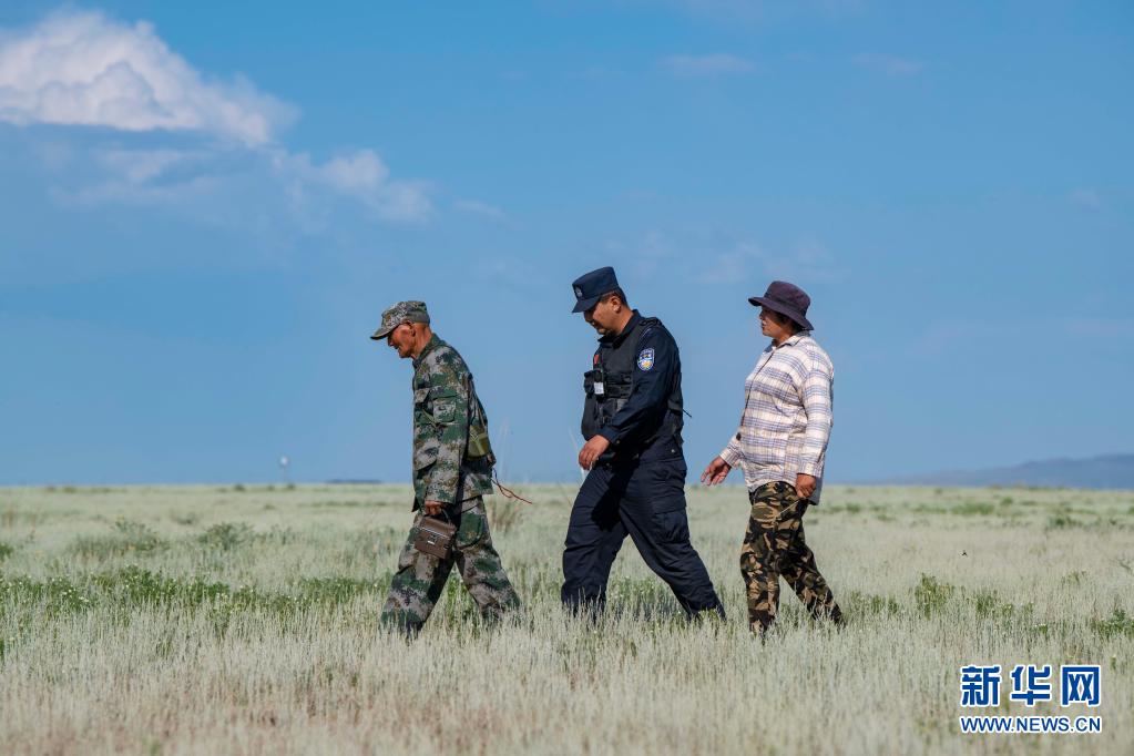 塔城边境管理支队吉也克边境派出所民警哈尔肯·阿斯哈尔(中)向放牧巡边的魏德友(左)、魏萍了解边境情况(6月9日摄)。