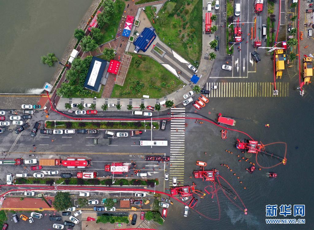 7月28日,消防救援人员在卫辉城区进行排涝作业(无人机照片)。