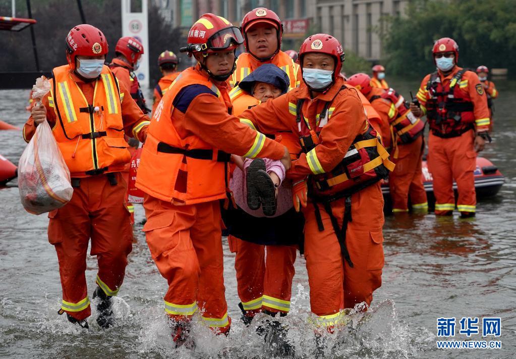 7月28日,在河南省卫辉市,消防救援人员转移被困老人。