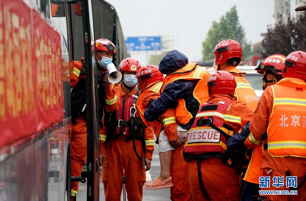 7月28日,在河南省卫辉市,消防救援人员将被困群众转移上大巴车。
