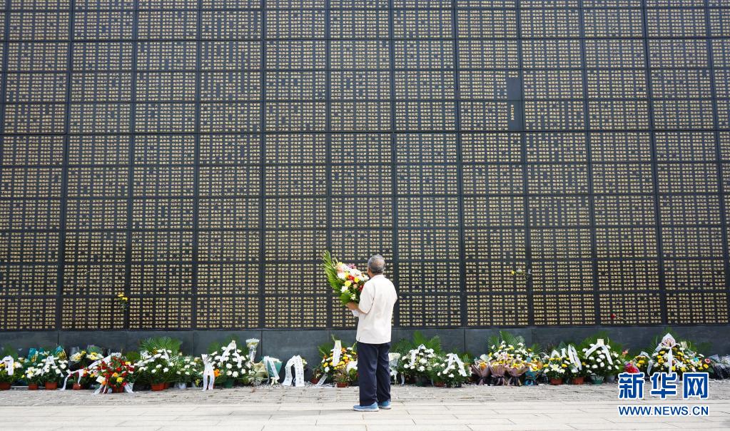 7月28日,在唐山地震遗址纪念公园,一名市民手捧鲜花驻足纪念墙前。