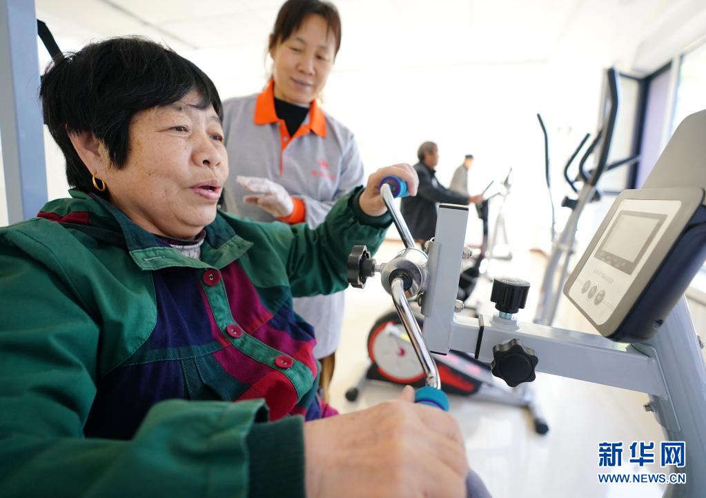 唐山市路北区煤研分院社区幸福家园养老服务中心工作人员在指导老人使用健身器材(2020年10月24日摄)。