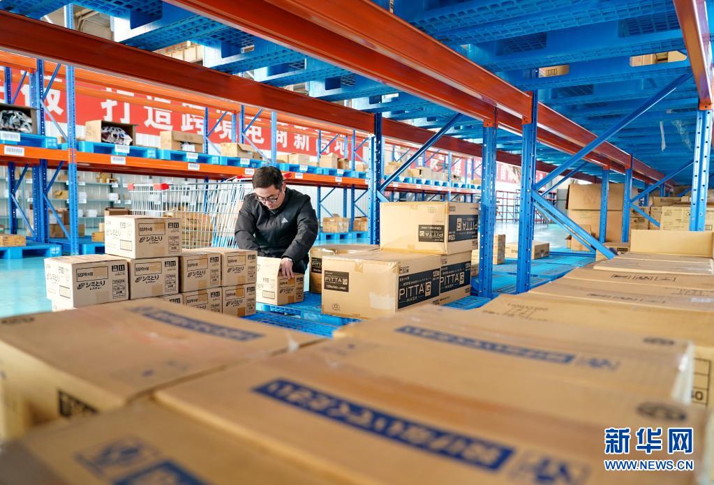 在唐山京唐港区保税物流中心,跨境电商企业工作人员在整理货物(2019年12月20日摄)。