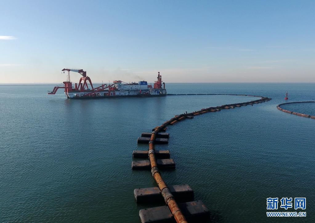 一艘施工船在唐山港京唐港区25万吨级航道工程海域施工作业(2020年3月14日摄,无人机照片)。