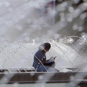 7月28日,在罗马尼亚首都布加勒斯特,人们经过喷泉池边。