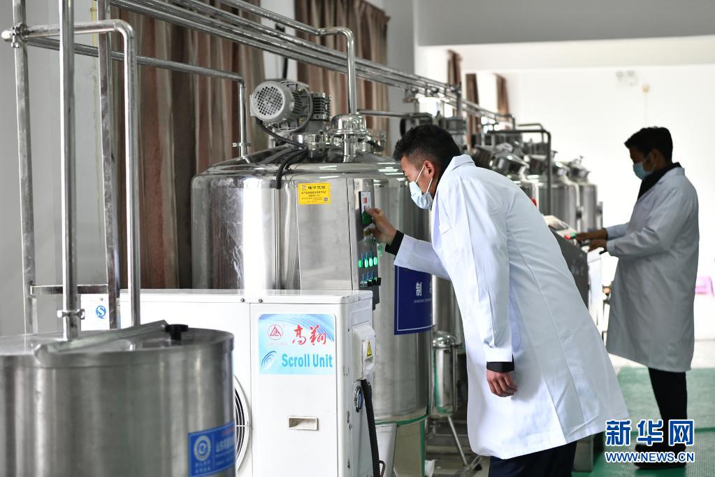 工作人员在西藏娘亚牦牛养殖产业发展有限责任公司的酸奶生产车间作业(7月28日摄)。