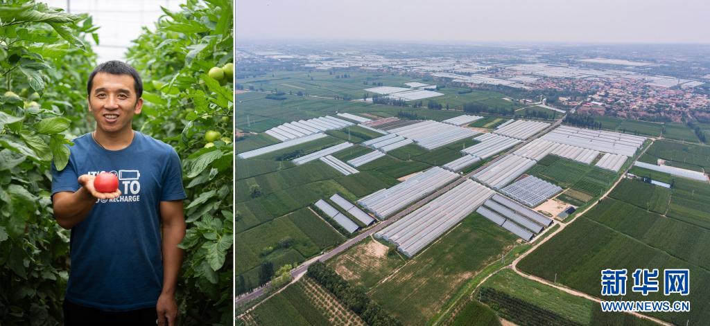 拼版照片:左图为王杰展示大棚西红柿(7月28日摄);右图为位于山西省晋中市太谷区闫村的蔬菜大棚(7月28日摄,无人机照片)。王杰是山西省晋中市太谷区闫村人,曾常年在外打工。闫村是当地发展设施蔬菜较早的村庄之一,2017年,在家人的建议下,王杰返回家乡开始种植大棚蔬菜。从最初的2个大棚,发展到现在的11个大棚,王杰种植的西红柿年产量可达到40万斤,带动了不少村民就近就业。