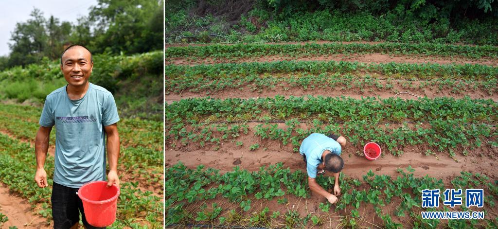 拼版照片:左图为姚伟在草莓育苗基地;右图为姚伟在草莓育苗基地忙碌(7月16日摄)。姚伟是山西省武乡县魏家窑村人,做过小买卖,干过建筑工,2016年回到村里发展奶油草莓种植。经过几年发展,姚伟种植的草莓规模不断扩大,带动了不少村民就业增收。2019年,魏家窑村建起了集休闲、餐饮、采摘、住宿为一体的乡村旅游体验园。姚伟在体验园里承包了5个大棚种植草莓,吸引了不少游客。