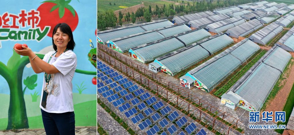 拼版照片:左图为龙巧玲在自家的大棚前(7月7日摄);右图为龙巧玲的西红柿大棚(7月7日摄,无人机照片)。太原市小店区刘家堡乡刘家堡村村民龙巧玲曾是一位全职妈妈,今年年初,她在家人的支持下回到家乡,承包了300多亩土地,开始种植大棚西红柿。为了拓宽增收渠道,龙巧玲在优化西红柿品种的同时邀请专业的墙绘团队为大棚的外墙画上了动漫形象,着重吸引采摘、休闲旅游的顾客,获得了良好的口碑。