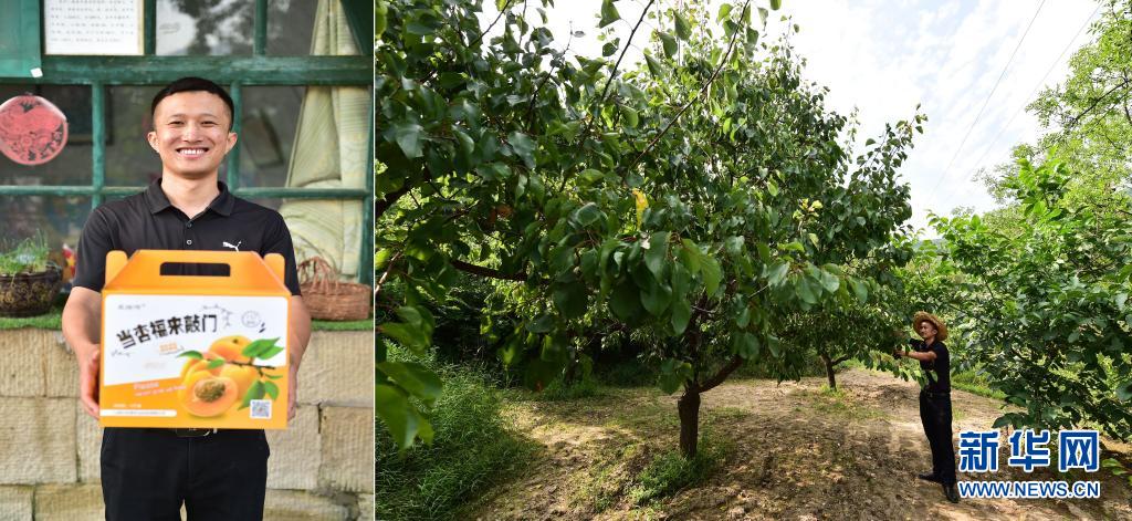 拼版照片:左图为梁永强在展示包装好的红杏;右图为梁永强在查看红杏的生长情况(7月27日摄)。今年28岁的梁永强是山西省太原市晋源区要子庄村人,2013年返乡创业种植红杏。梁永强的家乡是当地有名的“红杏第一村”,但一度因缺乏销路,导致大量红杏滞销。他返乡后,通过对接旅行社、学校等,帮助村民拓宽销售渠道。如今,梁永强种植了近百亩红杏,接下来还计划打造一个以红杏为主题的产业园,发展乡村旅游。