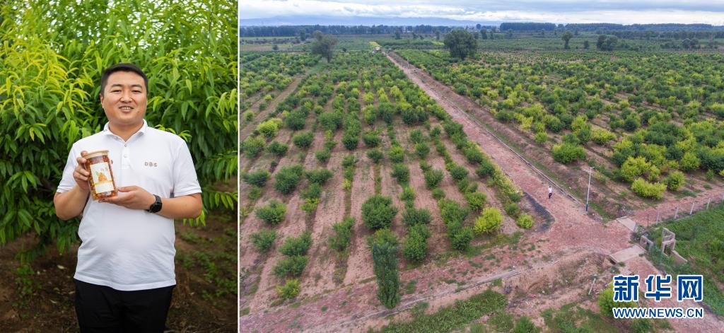 拼版照片:左图为陈晨在展示包装好的桃胶(7月22日摄);右图为在山西省晋中市榆次区北胡乔村,陈晨在果园里查看果树生长情况(7月22日摄,无人机照片)。陈晨是山西省晋中市榆次区杨村人。他曾经干过建筑行业,开过快捷酒店。2016年,陈晨了解到农业的发展前景和优惠政策后选择返乡,开始种植新品种桃树映霜红。目前,陈晨的桃树种植面积达到500余亩,年产桃子100多万斤,带动不少村民在家门口就业增收。
