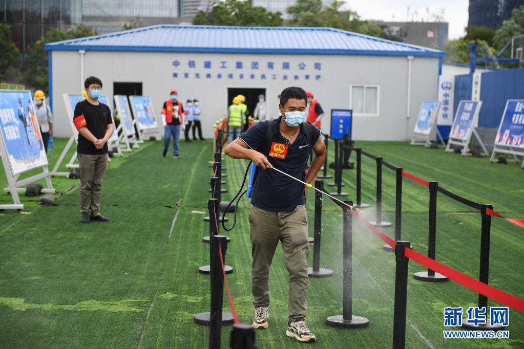 7月29日,工作人员在中铁建工集团南京无线谷项目部核酸检测点消毒。