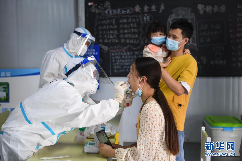 7月29日,在中铁建工集团南京无线谷项目部核酸检测点,建筑从业人员在接受核酸检测取样。