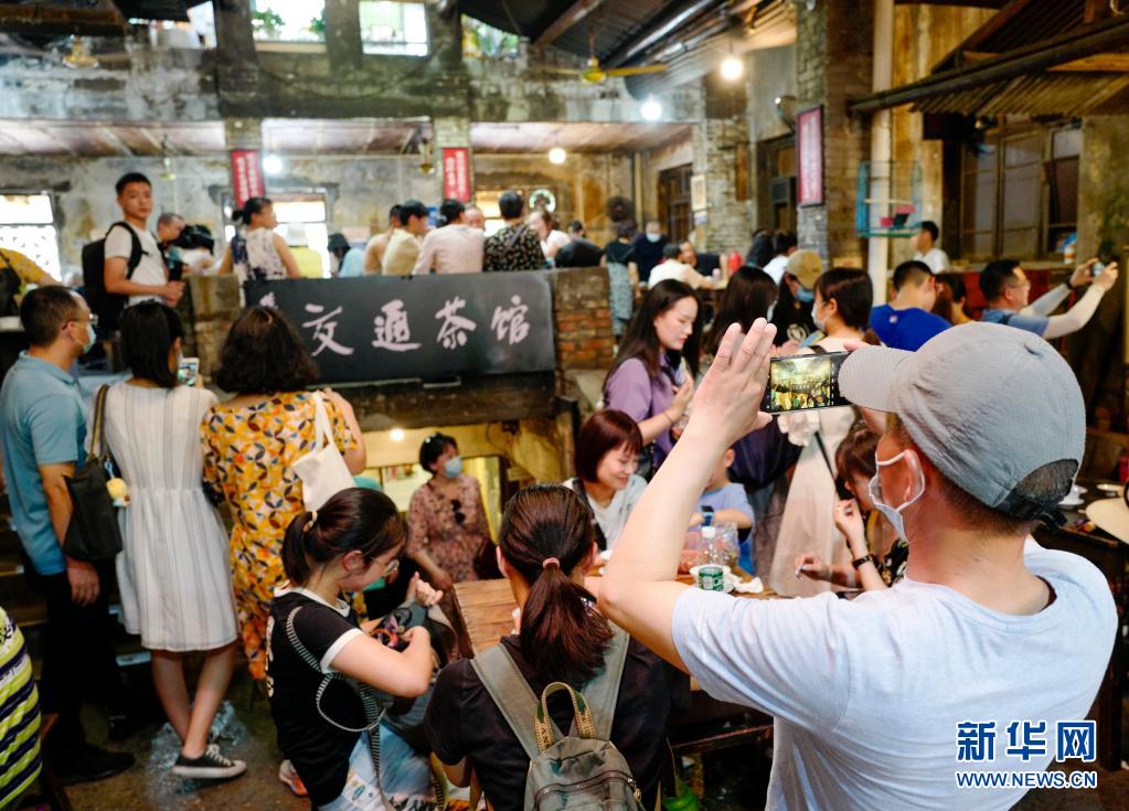7月26日,慕名而来的游客在交通茶馆内拍照打卡。
