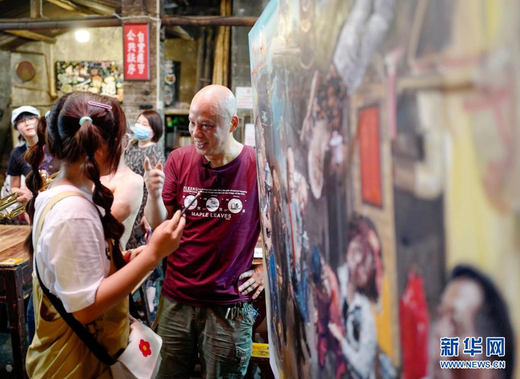 7月26日,在交通茶馆内,陈安健(右一)邀请游客在他的新油画作品上创意涂鸦。